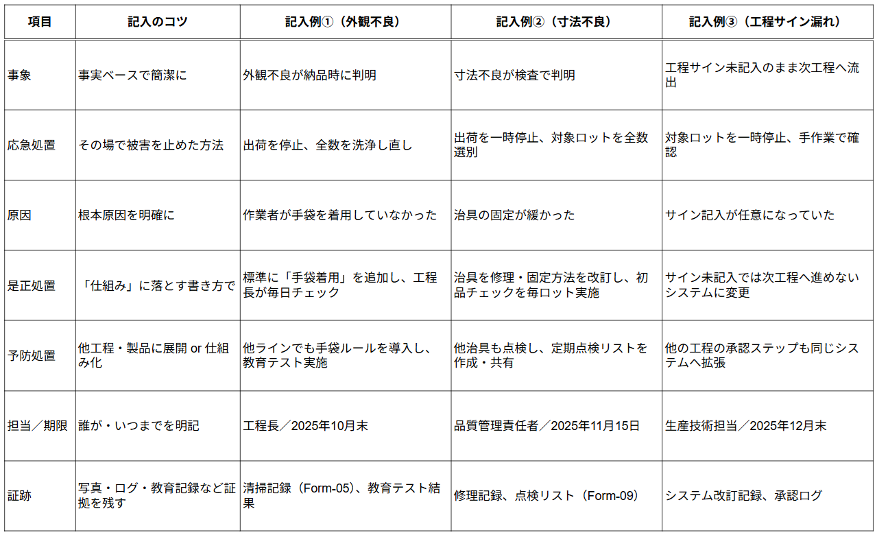 • 真の是正処置は「治具のガタを直す」「初品チェックを工程に組み込む」といった、再び同じ不具合を起こさない仕組み作りです💡