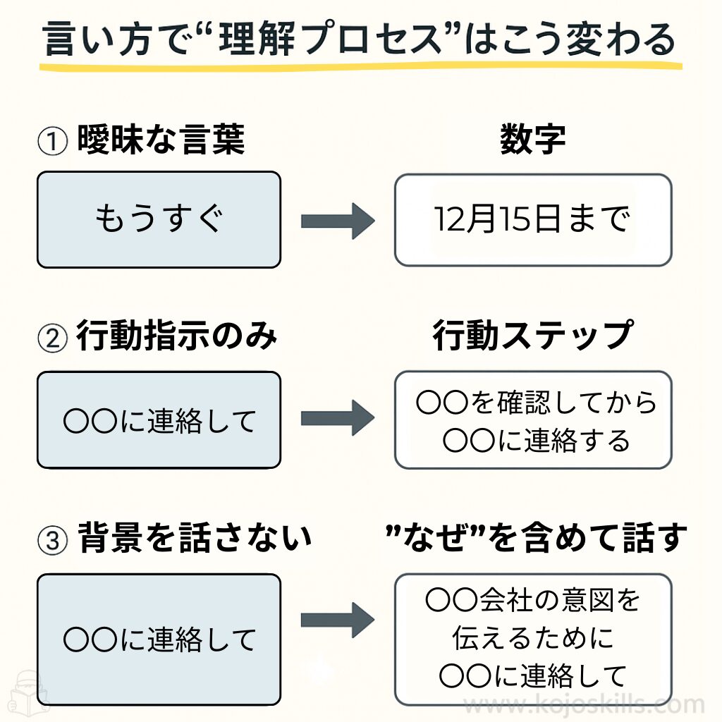 伝える側が“どう伝えるか”と“どうすり合わせるか”を意識すること が、コミュニケーションの質を大きく変えます。